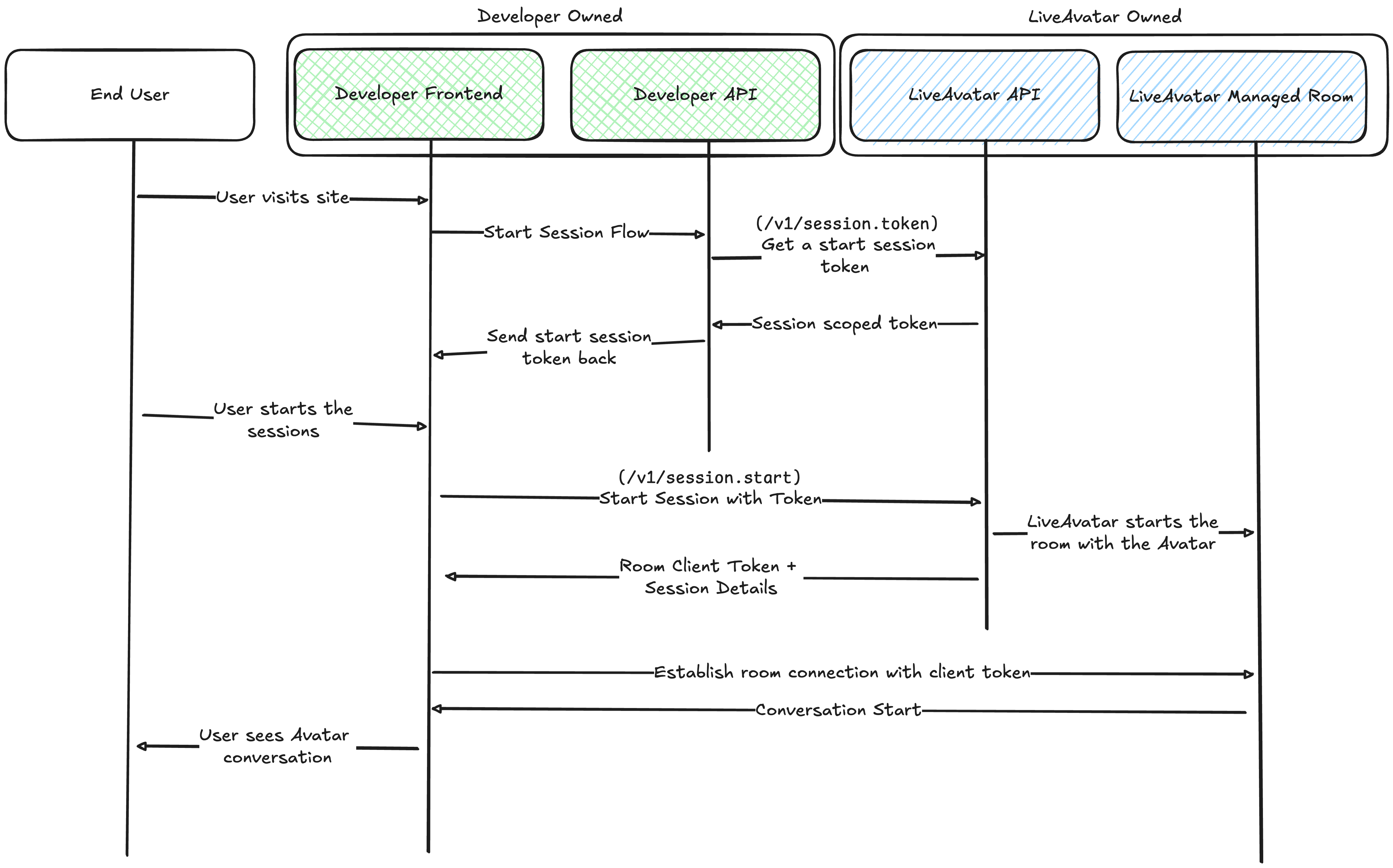 - After starting the session, we will provide the necessary information to establish a WebRTC connection between the end user's device and our LiveAvatar room.