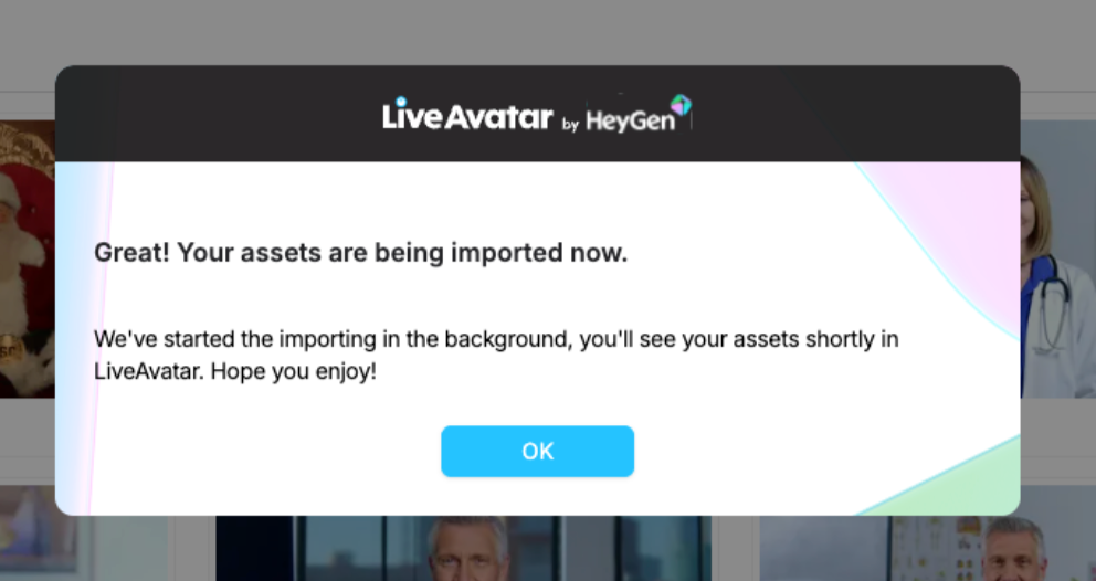 When starting the migration, on LiveAvatar side we will automatically migrate all assets over. We do this by making a copy of each asset from your HeyGen account into your LiveAvatar account.