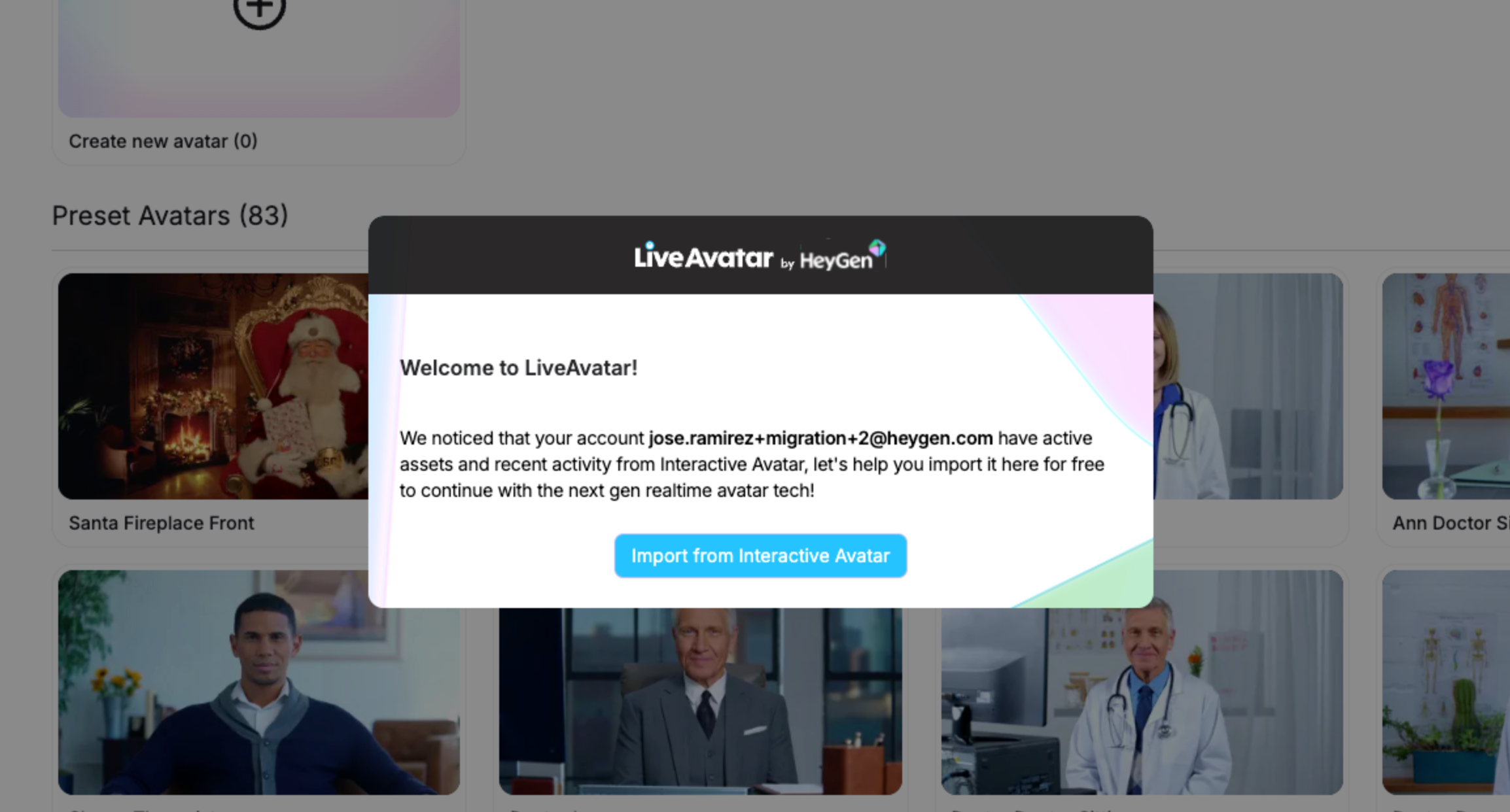 After copying over your assets, if you do not have an existing LiveAvatar subscription, we will grant you a temporary LiveAvatar subscription for 30 days. During this trial period, this will enable testing of the new migration changes and your changes will work across both LiveAvatar and HeyGen Interactive Avatar.