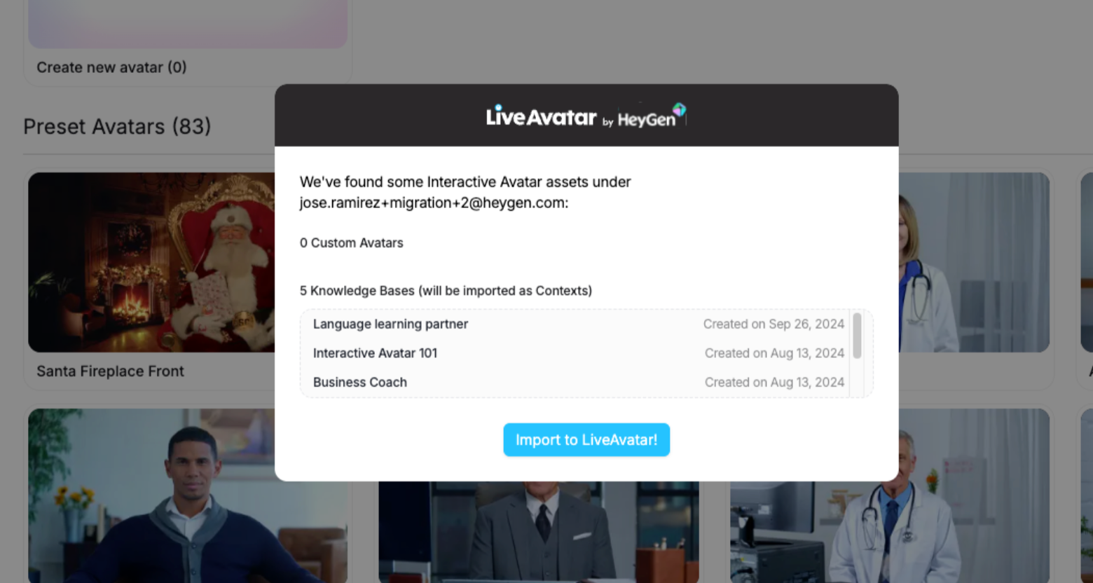 To start this first step of the migration, navigate to app.liveavatar.com. If you’re a space owner with any avatars or knowledge bases on HeyGen side, we will detect them and enable the asset migration flow.